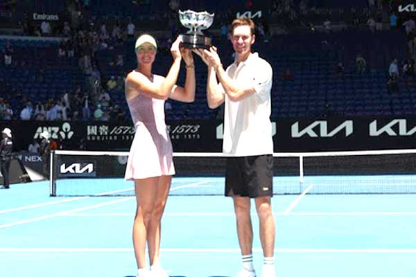 मेलबर्न (वीएनएस)। ओलिविया गैडेकी और जॉन पीयर्स ने ऑस्ट्रेलियन ओपन मिश्रित डबल्स का खिताब जीत लिया है। शुक्रवार को रॉड लेवर एरिना में खेले गए मुकाबले में गैडेकी और पीयर्स की जोड़ी ने फ्रेंच जोड़ी क्रिस्टीना म्लादेनोविक और मैनुअल गुइनार्ड को 4-6, 6-3, 10-8 से हराकर अपने खिताब की रक्षा की। मैच रोमांचक मोड़ पर पहुंचा जब दोनों टीमें टाईब्रेक में उतरीं। गैडेकी और पीयर्स 5-7 से पीछे थे, लेकिन अंतिम छह में से पांच पॉइंट अपने नाम किए। गैडेकी ने क्लच परिस्थितियों में शानदार प्रदर्शन किया, जबकि फ्रेंच जोड़ी ने भी कड़ी टक्कर दी।
